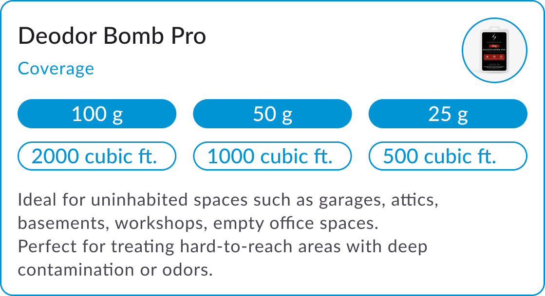 You may use Deodor Bomb Pro for uninhabited spaces. The coverage of the Pro version is 2x that of the regular Deodor Bombs.