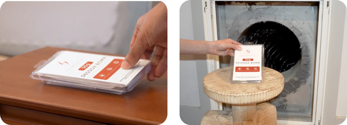 Distribute Deodor Bomb kits throughout the home. Space the kits apart in each room. Use buckets, side tables, boxes, stools, etc. to raise the kits at least three feet above the ground. Do not place packets directly on carpet or beds to avoid discoloration if spillage occurs.