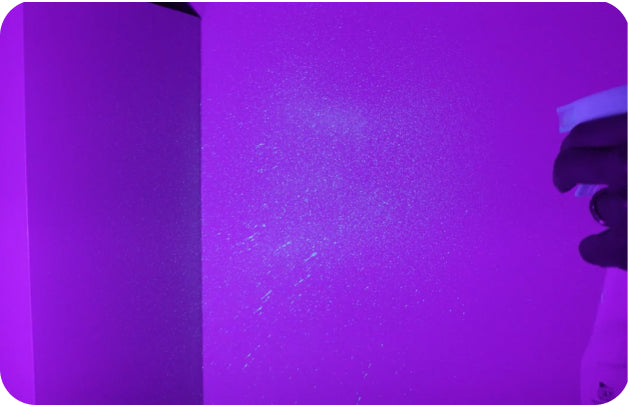 You may shine a UV light indicator over the surface to ensure desired coverage is achieved. The coating will appear speckled.