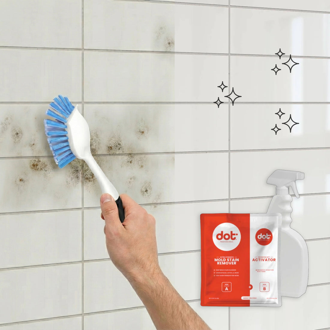 - Remove What’s Left Behind — After disinfection, apply DOT Mold Stain Remover to tackle lingering stains, grout discoloration, deep-set shower stains, and old mold shadows. Rinse after treatment.