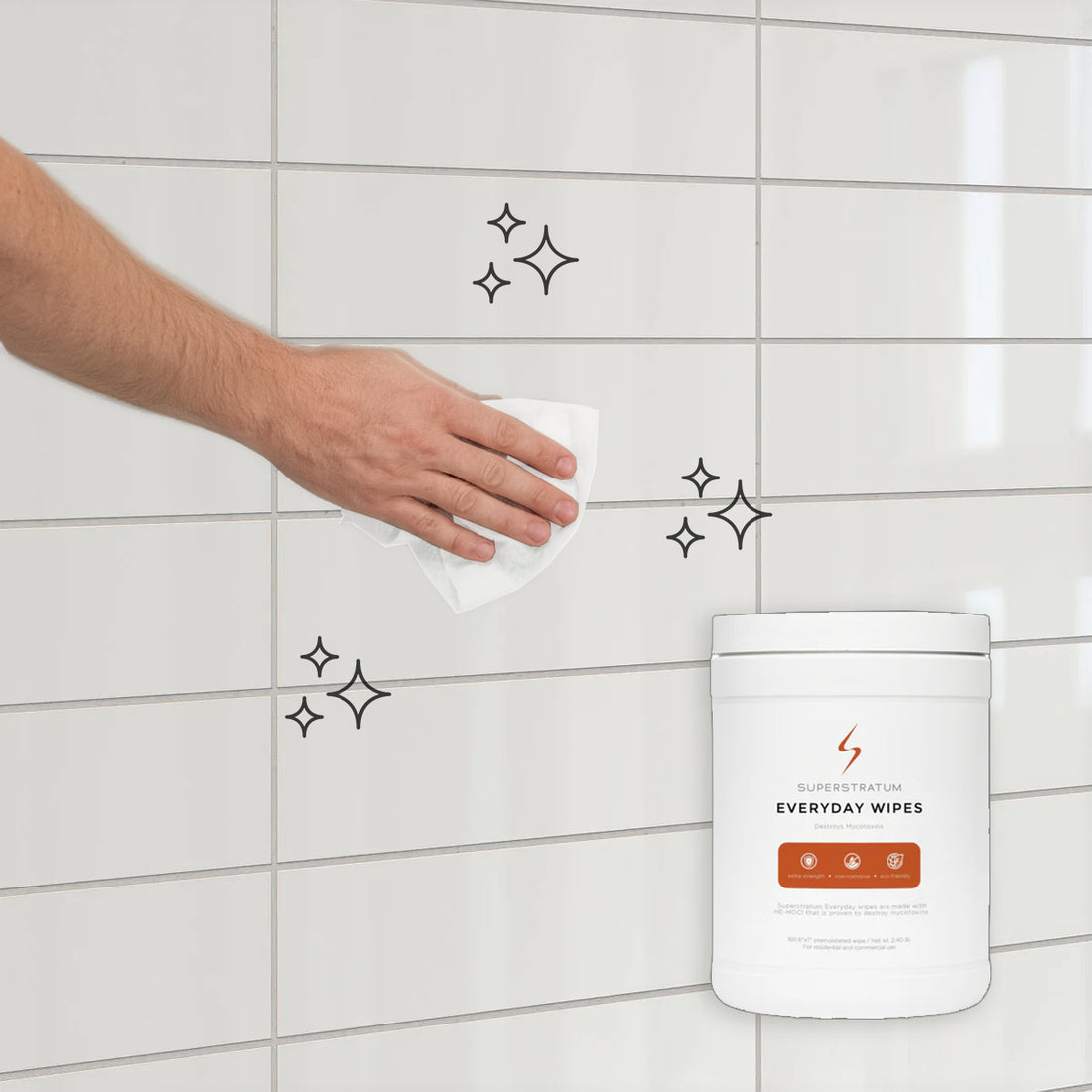 - Maintain the Reset — Use Everyday Wipes 2–3 times per week to remove soap film, moisture residue, biofilms, skin cells, and other buildup that commonly accumulates in humid bathroom environments. This helps keep the cleaned surfaces from “resetting backward.”