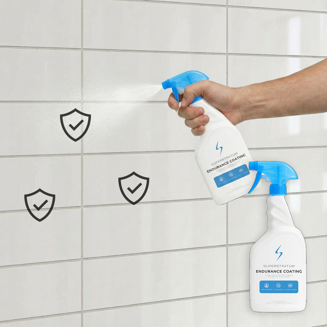 - Coat Surfaces for Long-Term Protection — Spray the Endurance Coating onto surfaces and let dry. The coating creates an invisible, water-resistant, mold-resistant barrier that helps prevent mold re-growth even in shower areas, and lasts for weeks (or longer on walls, floors, and ceilings).