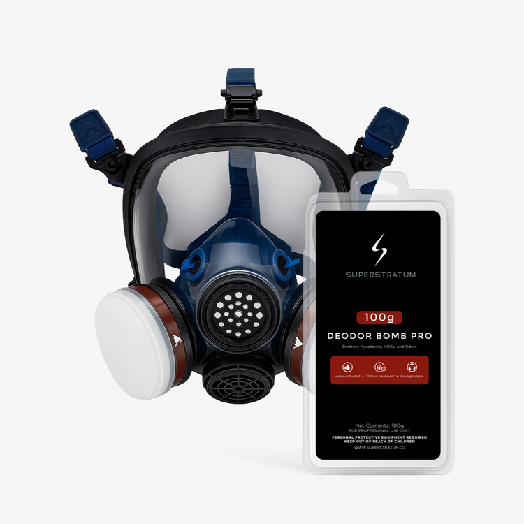 The PD-100 Full Face Respirator is a key piece of protective equipment used only during the Deodor Bomb Pro step of the Superstratum Whole Home System. When the Deodor Bomb Pro is activated, it releases a concentrated gas treatment into the air. This respirator provides full-face protection during that brief deployment period, helping shield your eyes, nose, and lungs from exposure while you're in the room to activate the treatment.