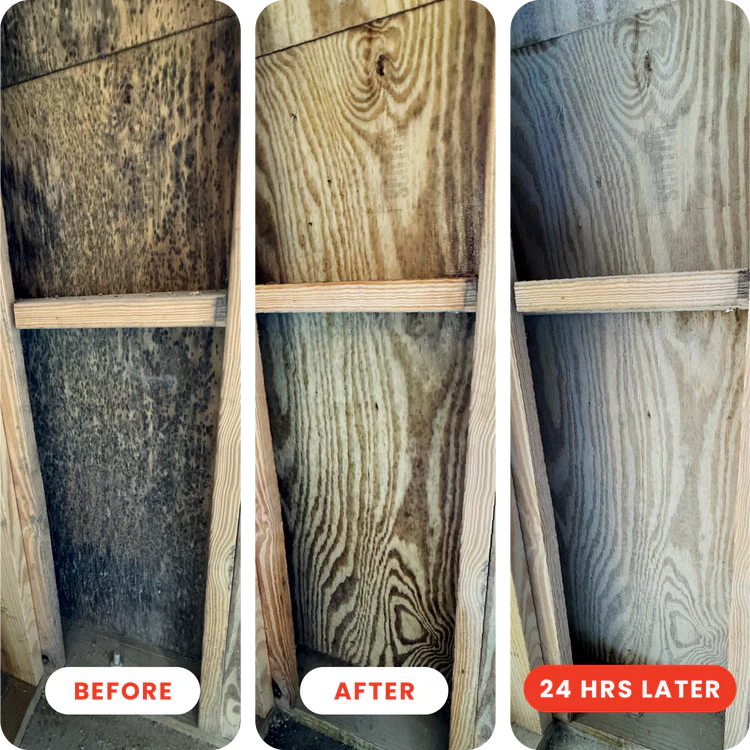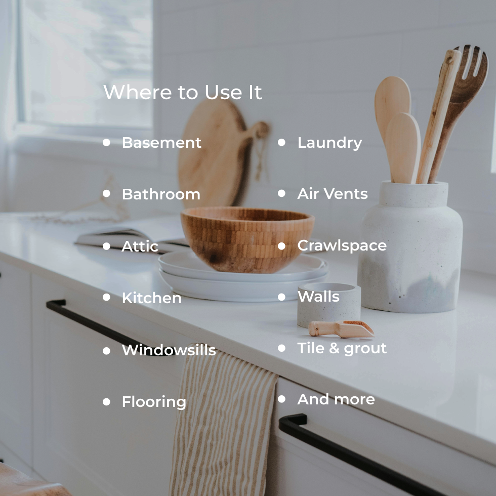 Eliminate tough mold stains from crawlspaces, attics, basements, bathrooms, wood framing, concrete, drywall, tile & grout, and more with DOT.